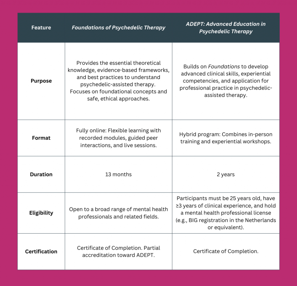 Foundations and ADEPT are complementary programs offered by the OPEN Foundation, each serving a distinct purpose in the professional development of mental health practitioners interested in psychedelic-assisted therapy.