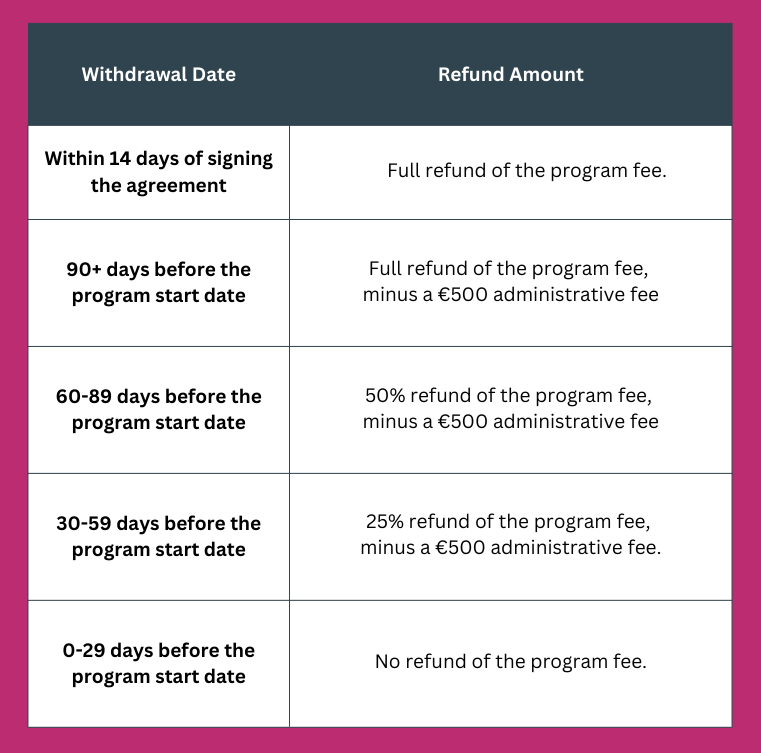 To secure your place, a non-refundable deposit of €1,500 is required upon acceptance. This amount will be deducted from your total tuition fee.
